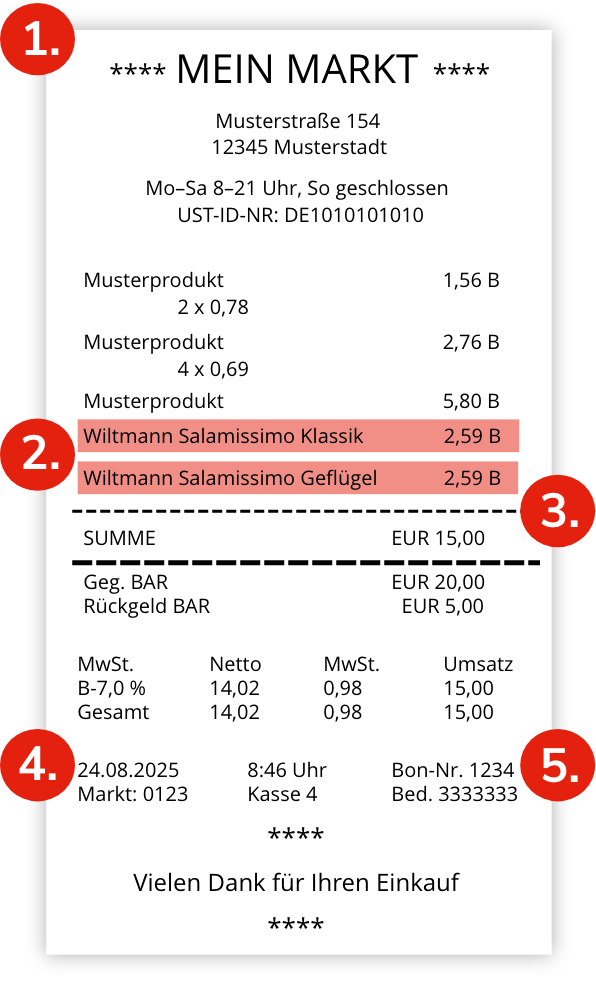 Lade hier ein gut lesbares Foto deines Kassenbons hoch, auf dem die beiden Aktionsprodukte, das Kaufdatum, die Kassenbon-Summe und die Bon-Nummer erkennbar sind.